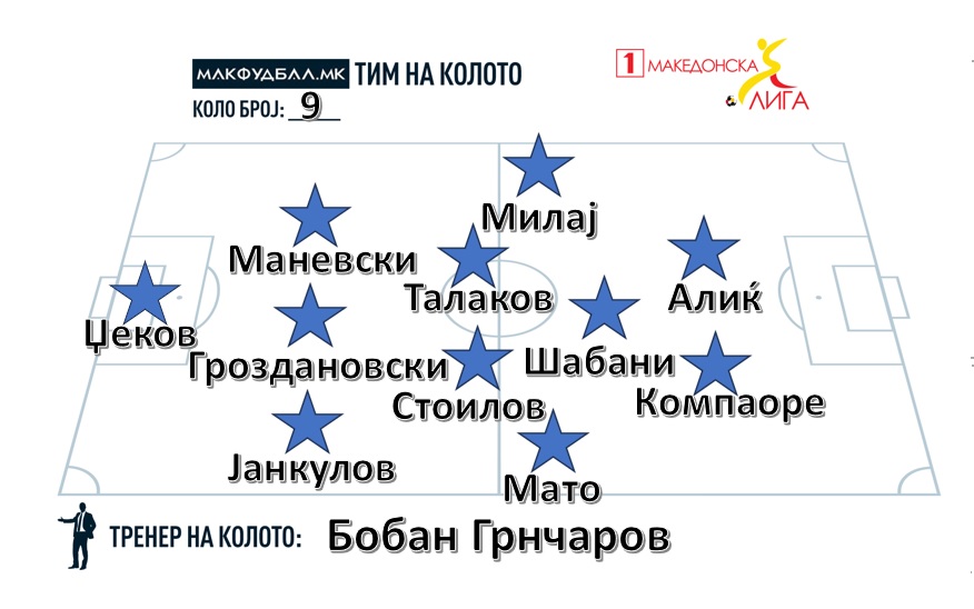 МАКФУДБАЛ го избра најдобриот тим за 9.коло во Првата фудбалска лига. Го предводи стратегот на Македонија ЃП, Бобан Грнчаров.